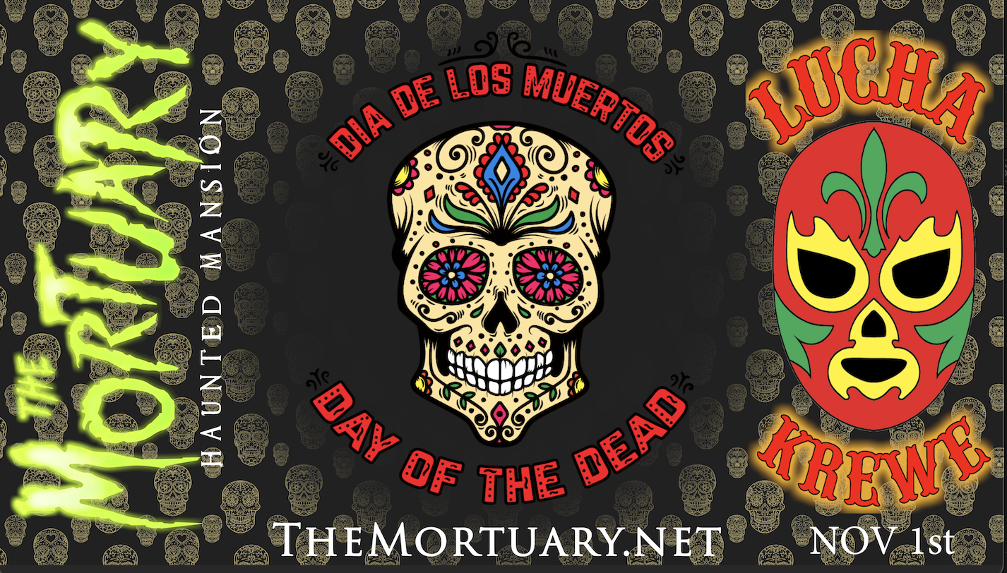 And joining us Saturday Nov 1st from 6 to 9pm… New Orleans’ own Lucha Libre wrestling and dance krewe, a non-profit social organization from New Orleans, that celebrates the culture, music, and heritage of Latin America and the Caribbean through year-round performances, philanthropy, and community engagement, is for “Hire” as your protector at The Mortuary! You will have the ability to “Hire” members of the Libre Krewe Wrestling to protect you and members of your party as you walk through the infamous Mortuary! All donations go to the American Cancer Society. Bring your families with young children or folks normally to scared to com, who always wanted to take on The Mortuary but were afraid to try. Make a donation to a great cause and battle the creatures of the night with a “professional wrestler!”
