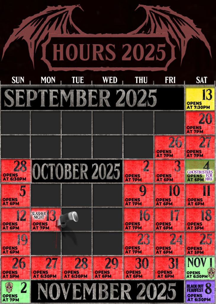 Typically, lines can be very long to visit The Mortuary. We want all of our fans to have a chance to enjoy The Halloween Season with at least one visit to The Mortuary. Hours have been extended for this exciting new Haunted House Experience. The Mortuary will open earlier that usual on some weekdays and during the day on Saturdays and Sundays. Exact days and times are shown on the calendar and while purchasing tickets.